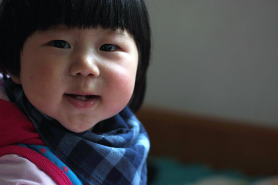 她快十个月了,头发盖在脑袋上跟陈真似的。