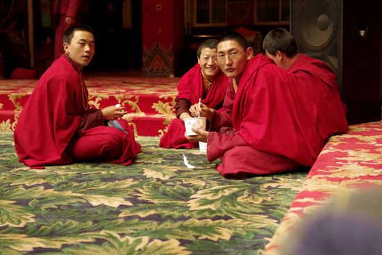 色达,一个很特别的地方。看到山上密密麻麻的房子,着实震撼,把整个山谷染得红红的。走进大经堂,很巧的是碰到他们正准备辩经,三三两两地聚集到大堂,越来越壮观。